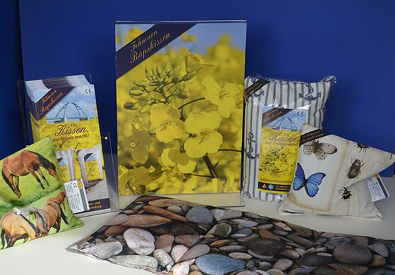 Anfänglich wurden die Kissen gemeinschaftlich von den Landfrauen hergestellt, um sie dann für den guten Zweck auf verschiedenen Festen auf der Insel Fehmarn zu verkaufen, manchmal direkt aus dem Bollerwagen. - die Erlöse gingen z.B. an die Opfer der Oderflut 1997 und 2 Jahre später in den Kosovo. Der Raps wurde abgefüllt in Einkaufsbeutel, die bedruckt waren mit dem Logo des Tourismus-Service der Insel Fehmarn. Wie bei vielen ehrenamtlichen Projekten fehlte irgendwann die Zeit, das Ganze fortzuführen. Die Landfrauen wussten von meiner Begeisterung über die wohltuende Wärme der Rapskissen und so kam vor 20 Jahren die Idee, in einer neu gegründeten Firma die Produktion der Rapskissen aufzunehmen..