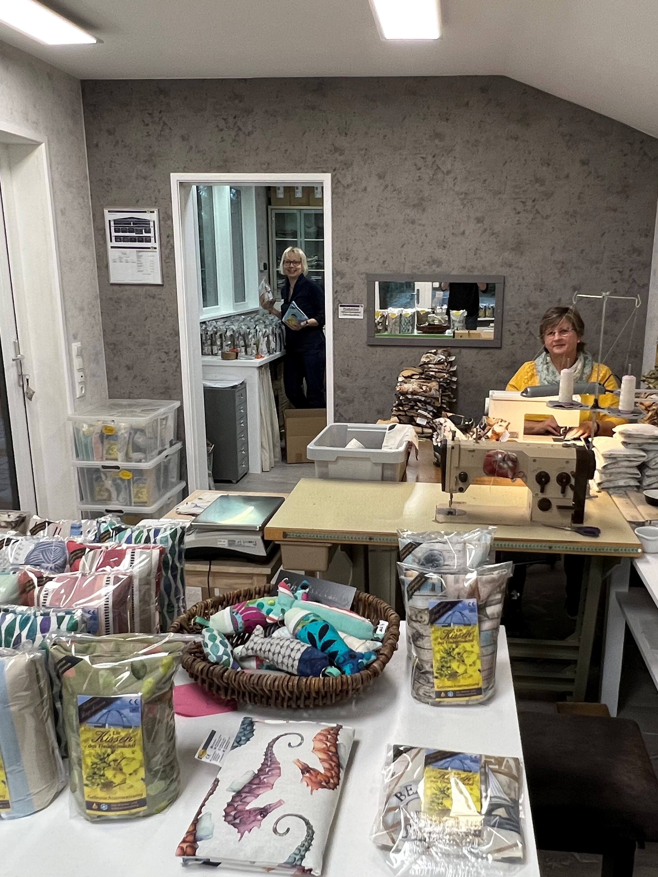 Die Kissen werden auf Fehmarn hergestellt von Mitarbeiterinnen, die hier wohnen und somit kurze Wege zum Arbeitsplatz haben. Alle meine Mitarbeiterinnen haben einen Ganzjahresarbeitsplatz. Die Herstellung vom Zuschnitt bis zur Fertigstellung erfolgt auf Fehmarn.